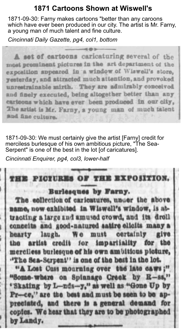 Accompanying the window display of the “Serpent” were a series of satirical caricatures by Farny, one of which included a satirical look at his own oil painting.