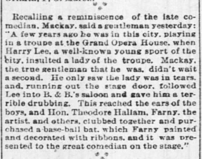 There may still be, somewhere out there, a baseball-bat painted by Farny for actor-comedian John A. Mackay. According to a March 24, 1891, article in The Cincinnati Enquirer, the bat was acquired by Farny, the Honorable Theodore Hallam, and others, then decorated by Farny. The bat was presented to Mackay at one of his shows sometime in the 1880s as a result of defending a lady insulted at the Grand Opera House. Harry Lee was the insulter and, when Mackay learned of the insult, he hunted down Lee at B. & B.’s saloon and delivered a drubbing to him. Unfortunately, I have no pics or description of the bat, nor could I find an exact date for the event.