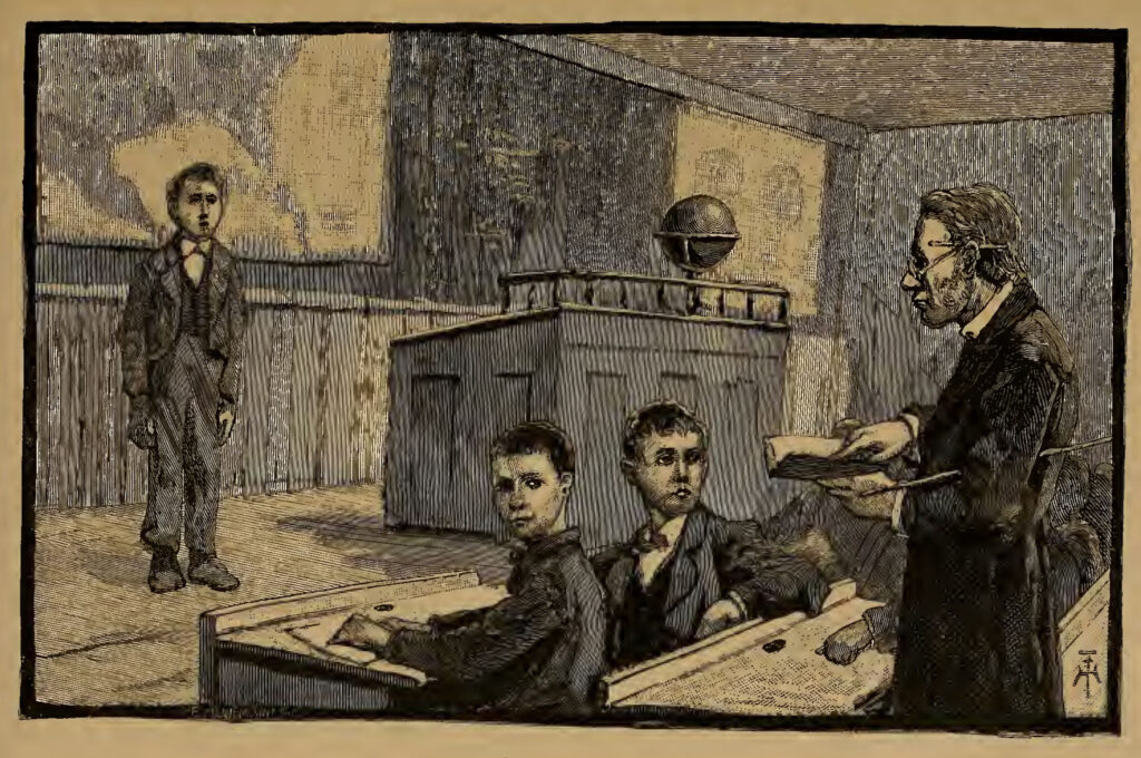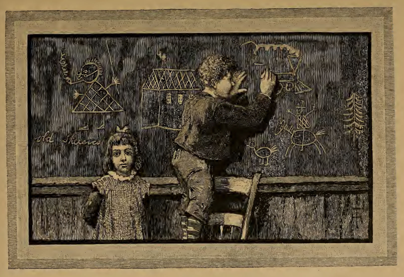 Two of the images in Teacher’s Dream, the “sledding scene” on page 9 and the “man in the middle of the road” on page 33, also appeared in the The Union of American Art and Poetry, which came out a year earlier in 1880. The captions below down’t appear on the pages with the images; instead they appear on a List-of-Illustrations page at the start of the book: