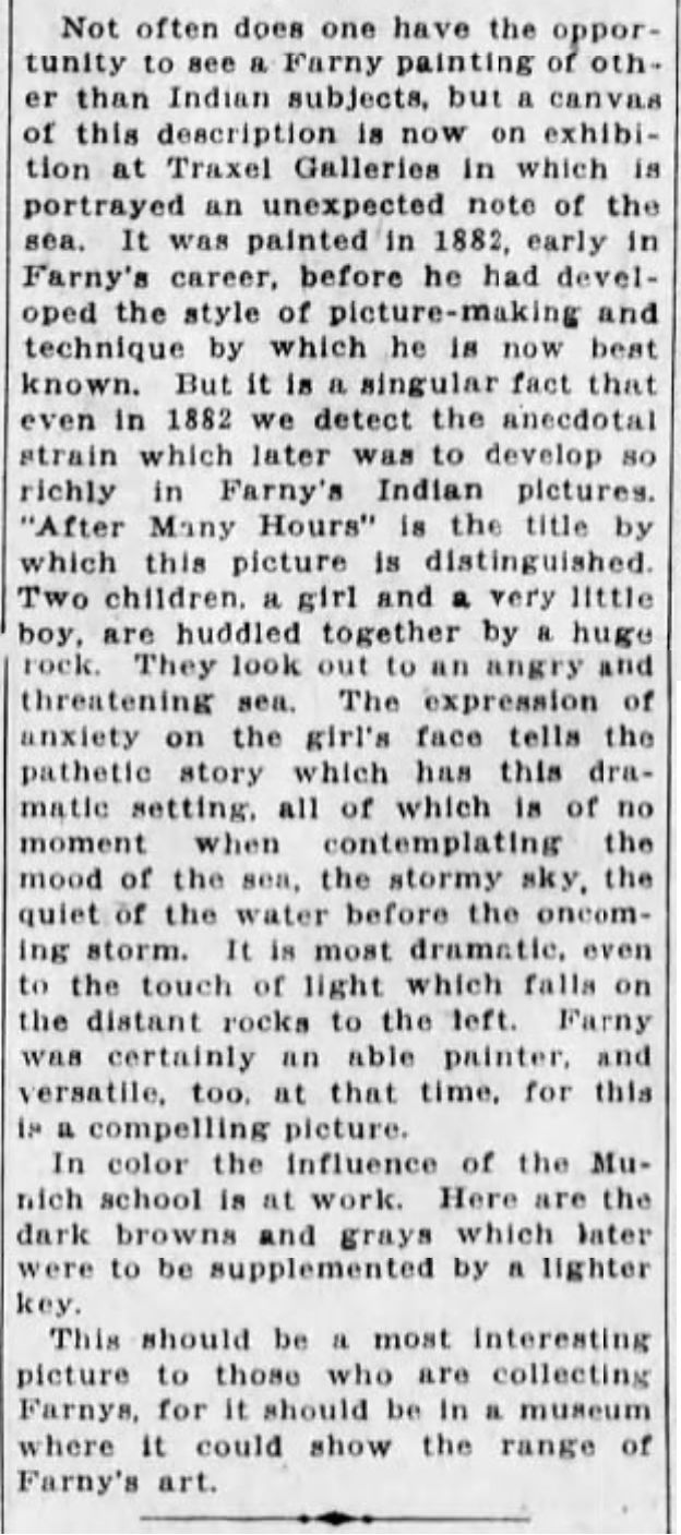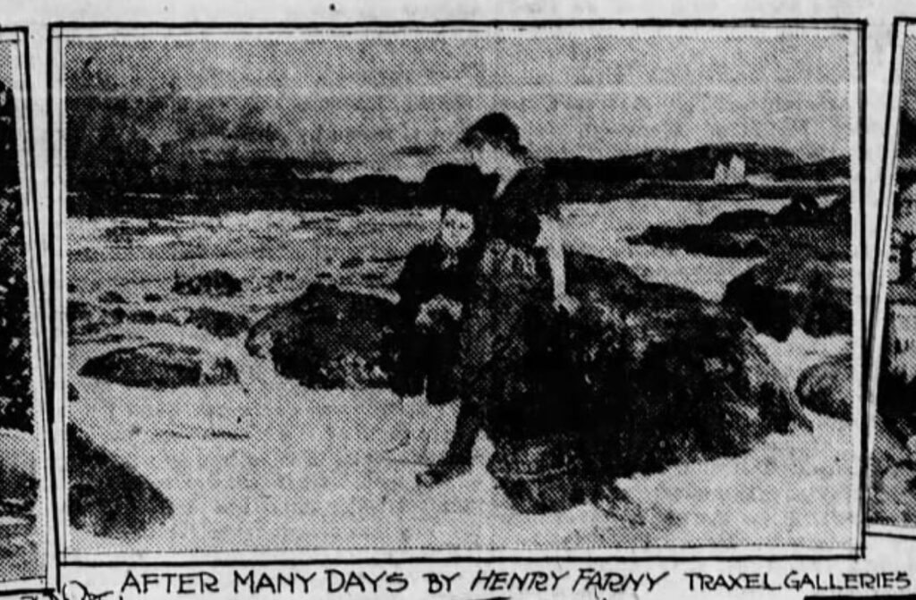 Mr. Farny makes an amusing calculation on the actual cost of his picture, “After Many Days” which sold for $76, in which, after allowing for the hire of a model, paints, canvas. a frame that didn’t suit and one that did, he finds he has netted just $9.50 on a picture that cost him two months’ work. He has just sent a distemper drawing to Harper’s Weekly, upon which he was engaged less than two weeks, and for the copyright of which he received $125. “I can’t afford the luxury of painting,” he said, “at least not for this market.”