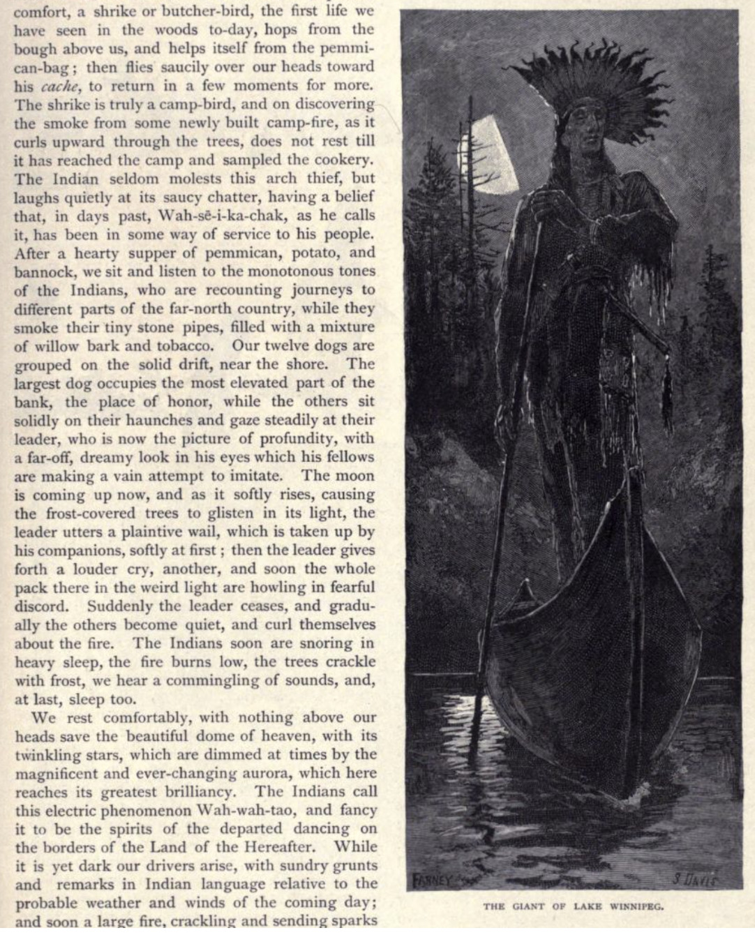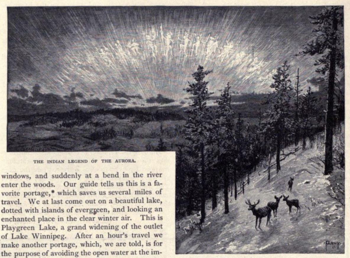 Note that two of the images appear thirteen years later in a 1895 book The Native Races of North America. The image labeled The Indian Legend of the Aurora below that appears on page 104 is relabeled War Dance in the Sky in the Native Races book. The image labeled The Camp at Night that appears on page 107 becomes Camping Out in the Snow in the North-west in the Native Races book.