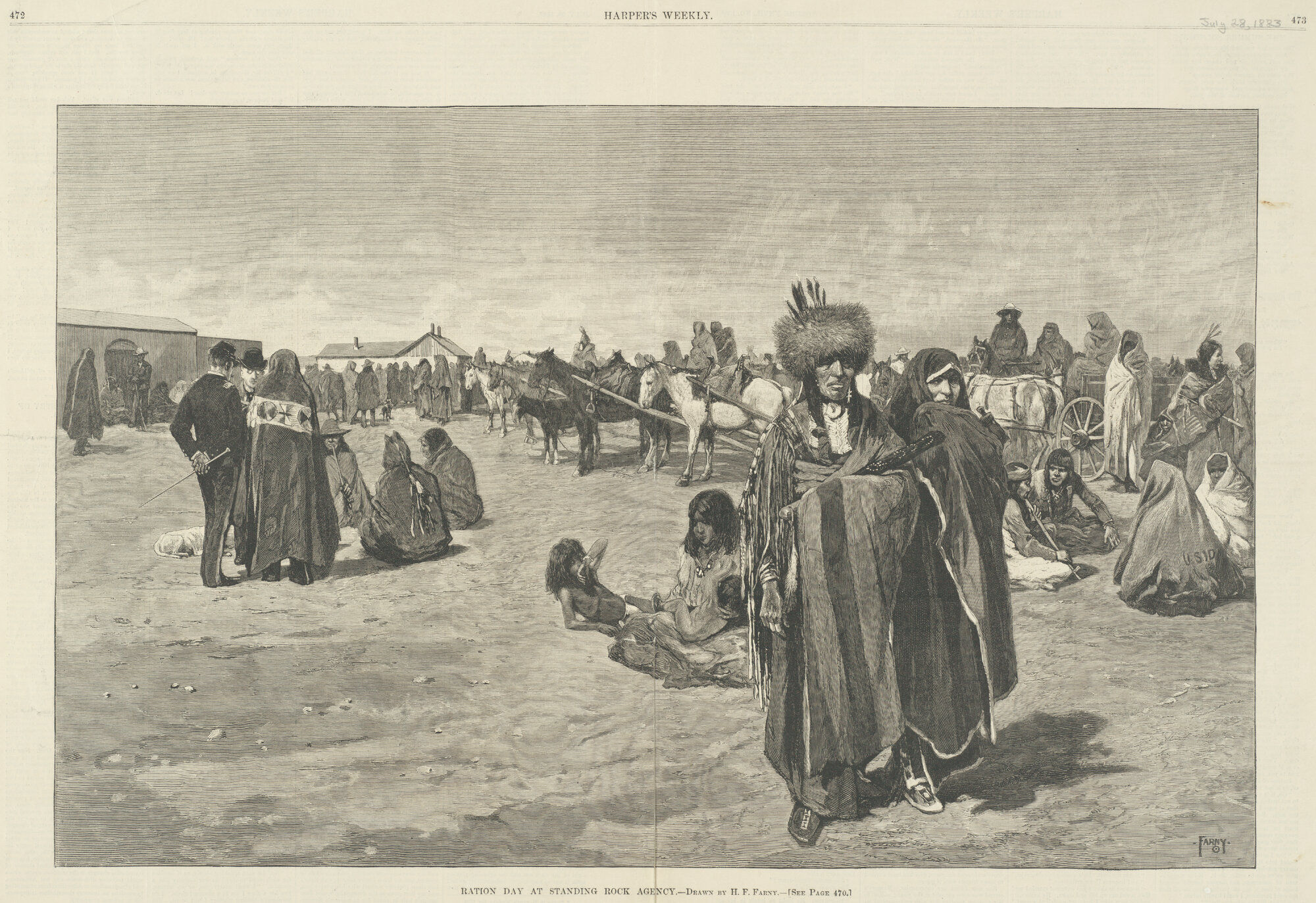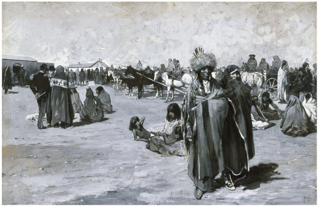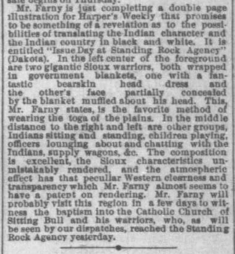 On May 14, 1883, the Cincinnati News-Journal reported that Farny had completed a painting he called Issue Day at Standing Rock and would soon send it to Harper’s Weekly. The article included a description: