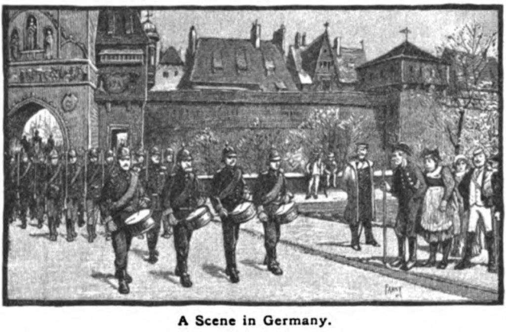 Page 68: A Scene in Germany, 1883-Preface-The-Eclectic-Elementary-Geography-Farny-Illustration-A-Scene-In-Germany-pg68.jpg, https://babel.hathitrust.org/cgi/pt?id=hvd.32044097023451&seq=74https://onlinecollections.syr.edu/objects/33858/parading-the-troops