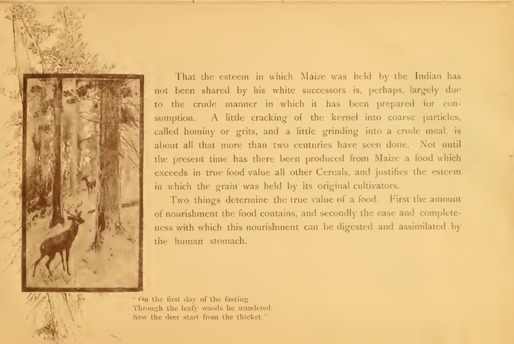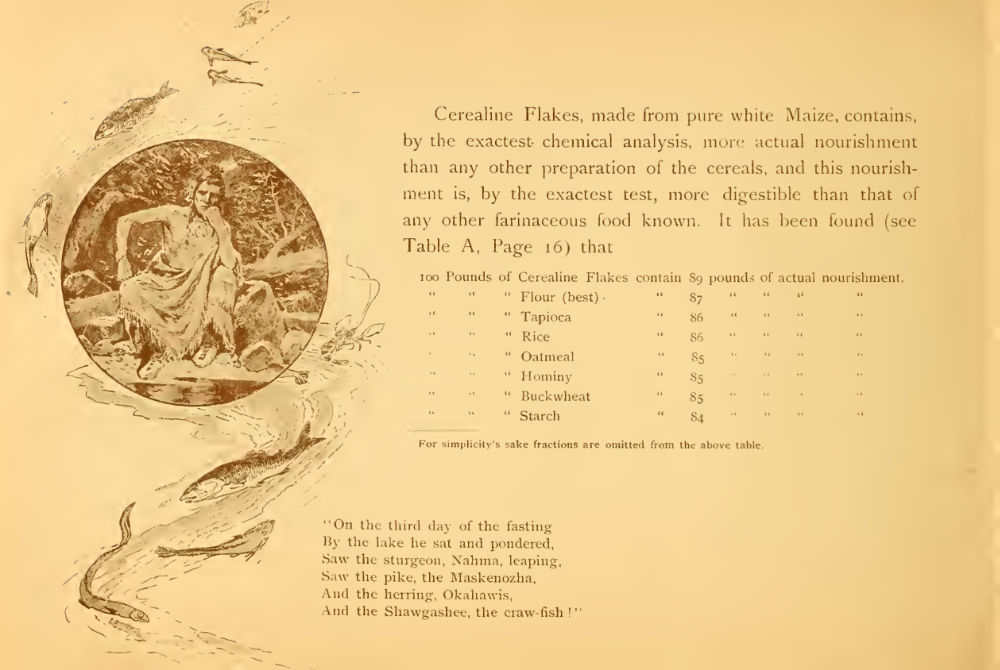 Cerealine were uncooked mashed grits that, before baked and used as cereal, were used in the brewing industry. At some point in the 1880s they were toasted (and malted?) and were sold as a breakfast cereal. To boosts sales, Henry Farny was enlisted to create a seventeen page brochure combining the benefits of consuming Cerealine with the pastoral ideals of farming, Indians, and nature.