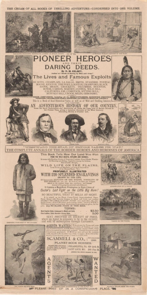 In 1887, Author D. M. Kelsey released a 672 page book Our Pioneer Heroes and their Daring Deeds. Covering a wide number of famous people of the time, Farny contributed at least two illustrations to the book. He used his “Symbol” mark in both.