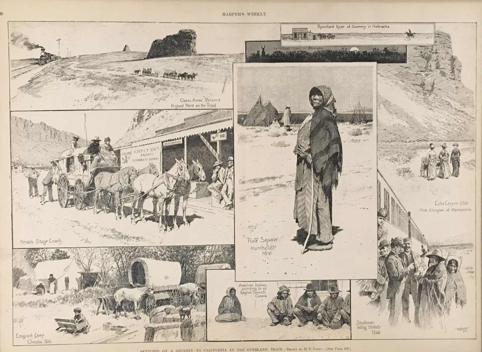 Farny’s sketches over pages 220-221 for the March 22, 1890, issue of the Harper’s Weekly accompany a page 223 story on the terrain and challenges facing those still traveling West via wagons. Given he’d ridden the Union Pacific over this territory at least twice (once in 1884 and once in 1887), he would have been familiar enough with it, coupled with existing photos, to draw these images. I have not run across any original drawings of these vignettes.