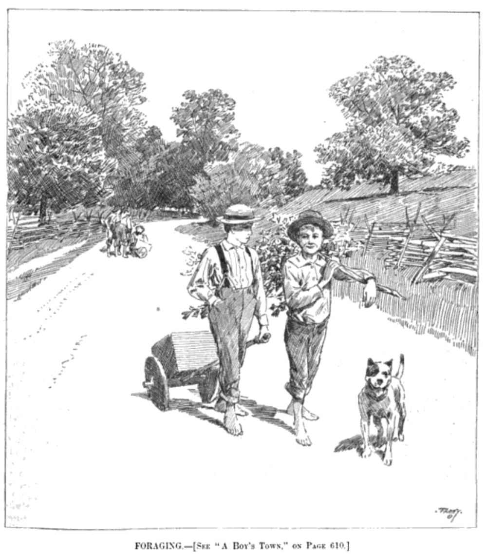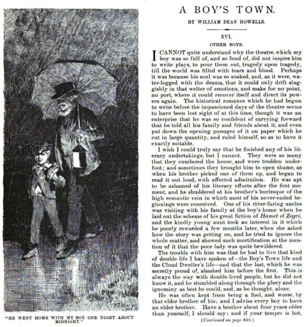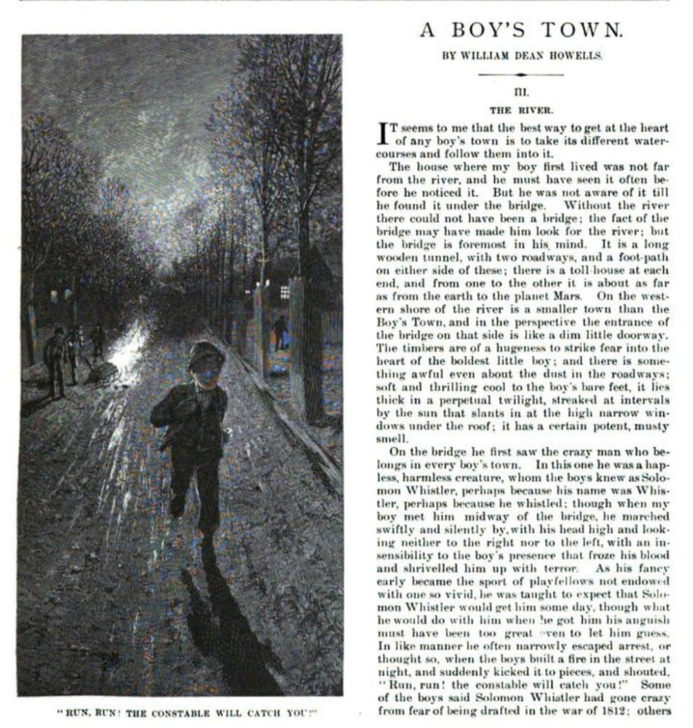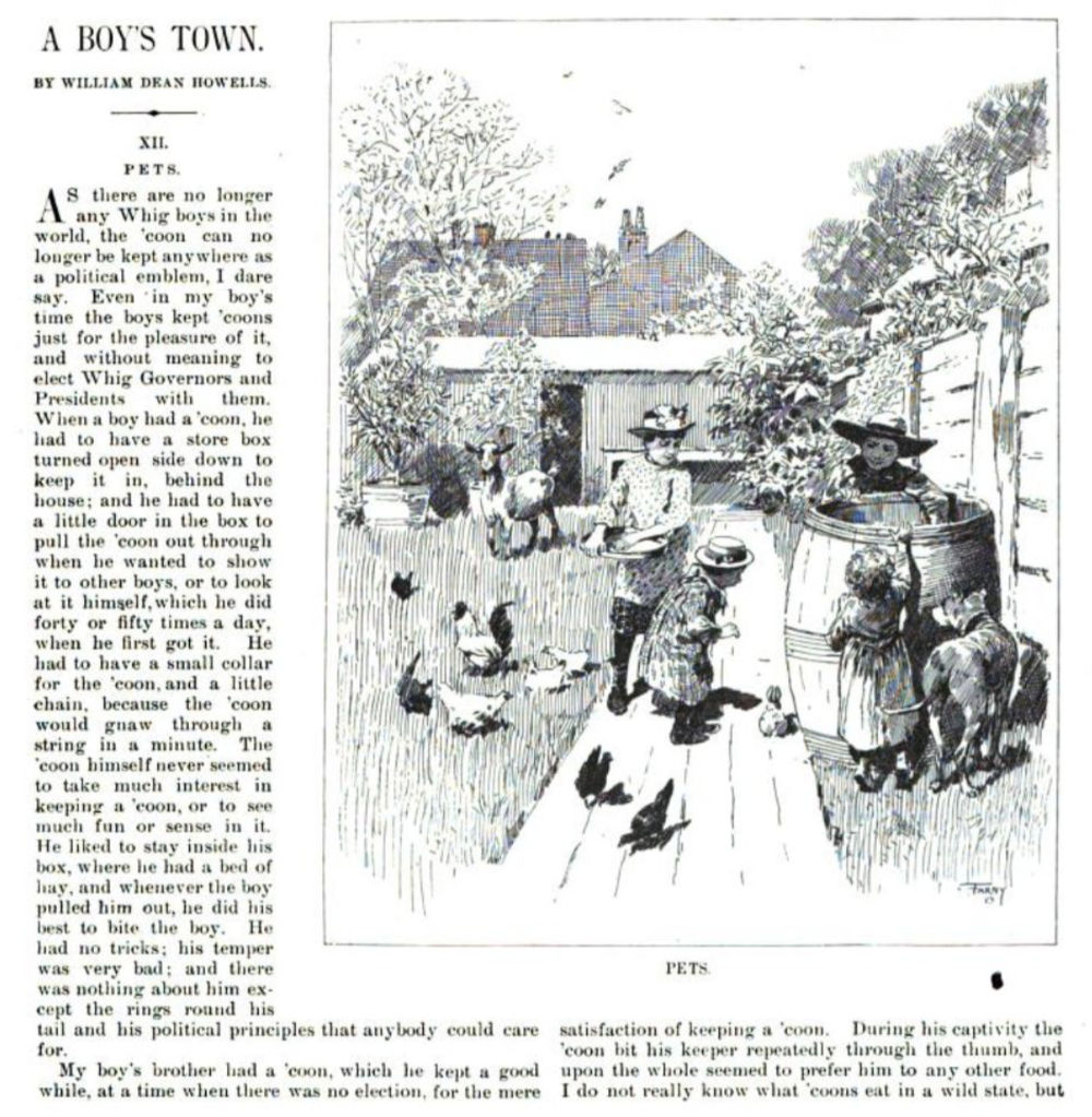William Dean Howells wrote A Boys Town that was published as a serial by Harper’s Young People between April 08, 1890, and August 26, 1890. There were twenty images total by Farny. This was the last serialized magazine story that Farny illustrated(at least that I have found).