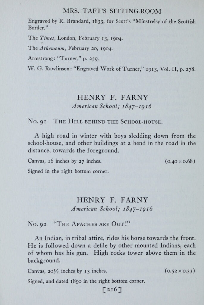 The Apaches Are Out! remained in Taft’s collection through 1920, where it is listed, on page 16, as part of an accounting of his entire collection.