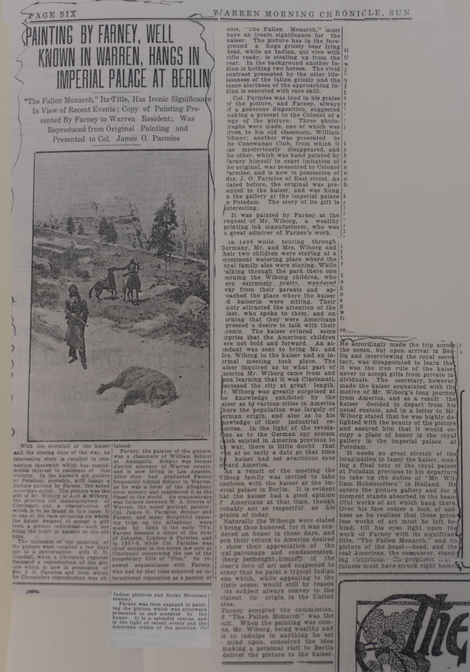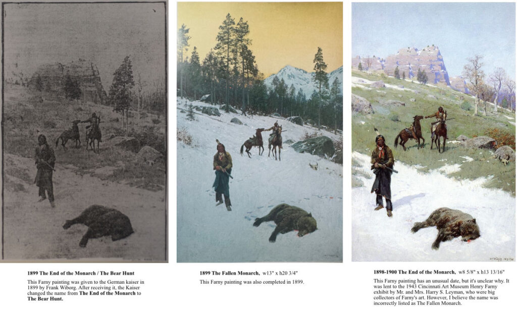Having planned a return trip to Germany, Wiborg commissioned Farny to create a painting that he could give to the Kaiser. Farny named the 1899 painting The End of the Monarch (note: it could have been completed in late 1898, which might explain the 1898-1900 date on the painting below, but I can get no confirmation either way). Before Wiborg took the painting with him, Farny took several photos of it, one of which he apparently painted over for a friend, J.O. Parmlee (see story in first article below). Also in 1899, Farny created a near copy of The End of the Monarch, titling it The Fallen Monarch.
