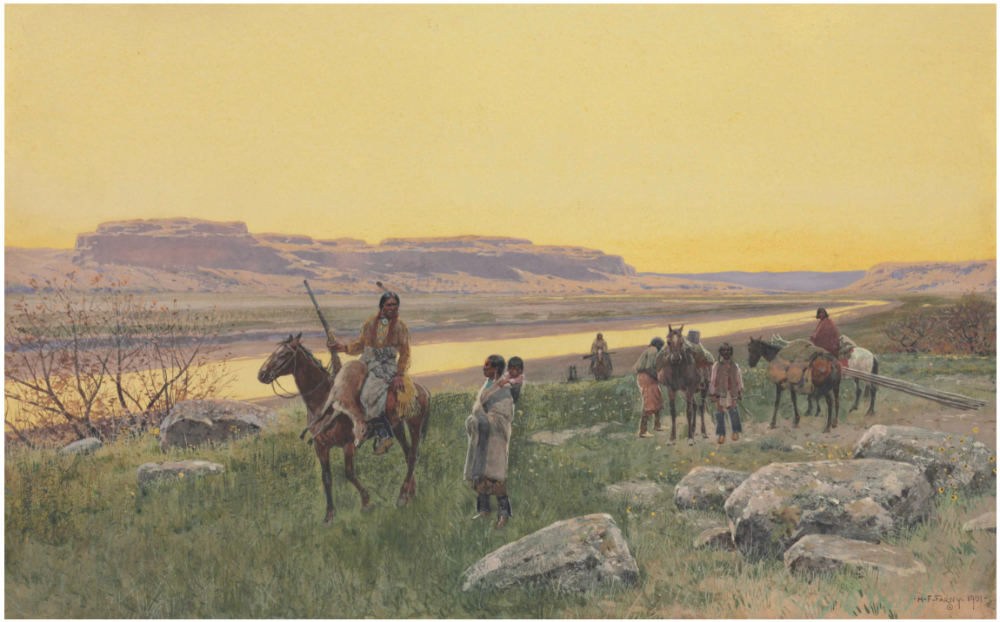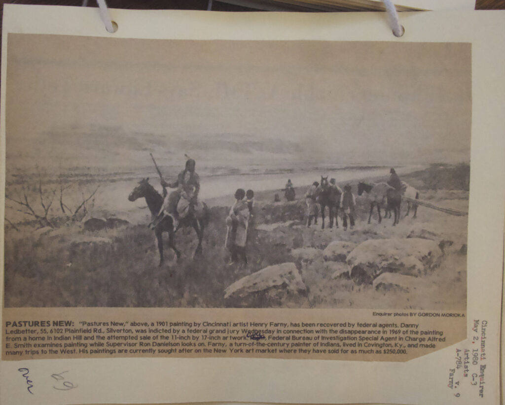 In 1901, Farny completed “Pastures New“. In 1969, this painting was stolen from a home in Indian Hill. An attempt to sell the painting in 1980 resulted in the arrest of the perpetrators and the recovery of the art piece. Do not confuse “Pastures New” with 1901 “In Pasture’s New”, which has a similar look. There are also several other paintings by the same name, such as 1896 Pasture’s New, 1895 In Pasture’s New, 1891 Pasture’s New.
