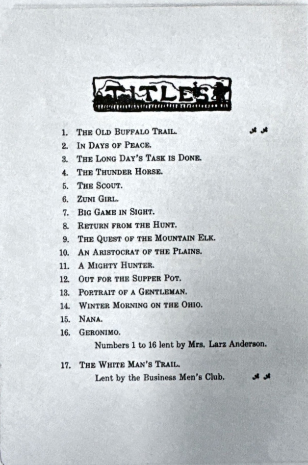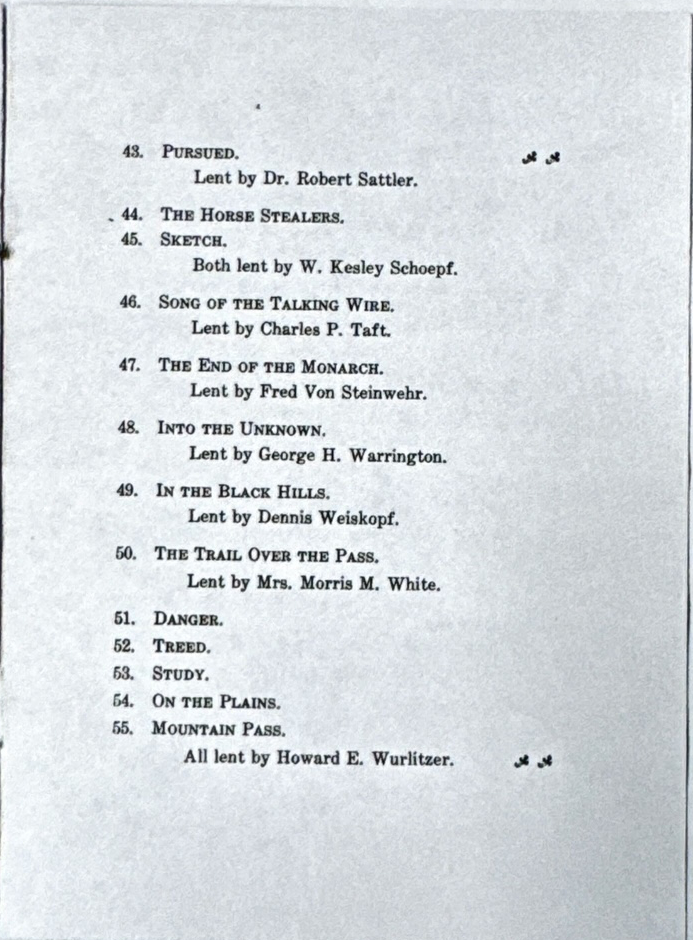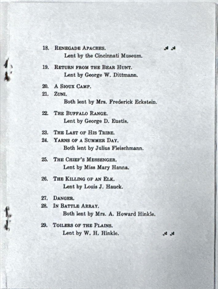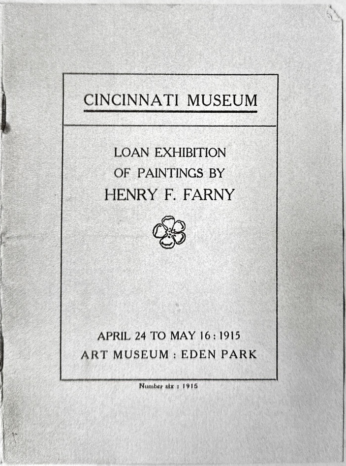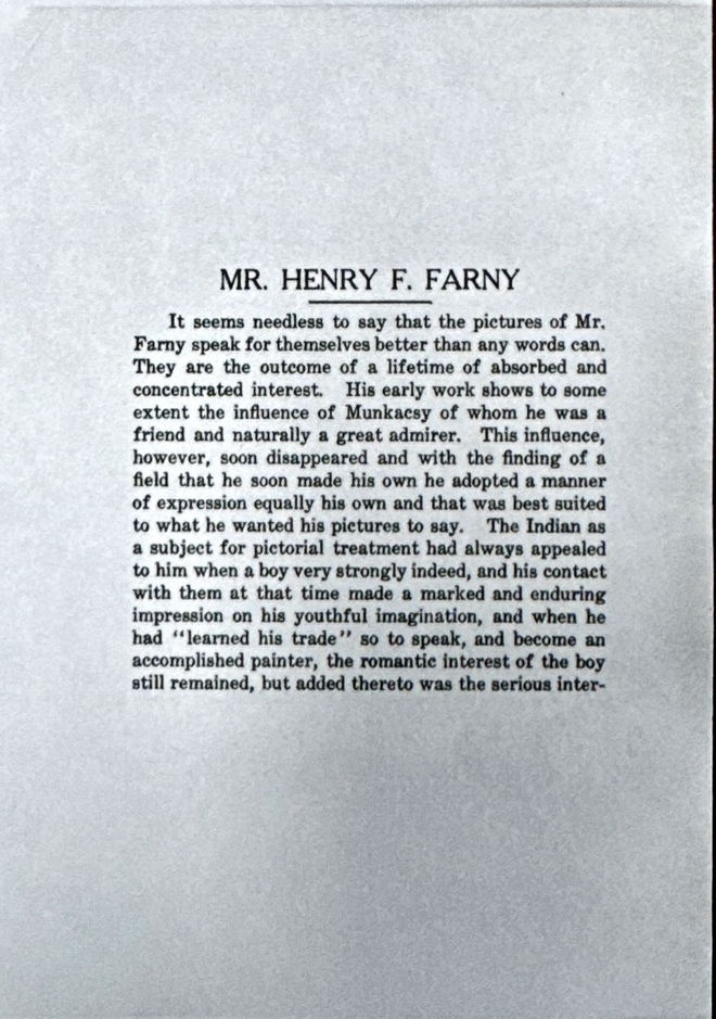 In 1915 the Cincinnati Museum featured a showing of Farny’s works two years before he passed away. There are some unique painting names that don’t appear in any other exhibits or books. Without dates, some of these paintings are difficult to connect with modern examples. The text of the document will be followed by scans of photocopies of the 1915 booklet (thanks to Suzanne Nunez for these scans!)