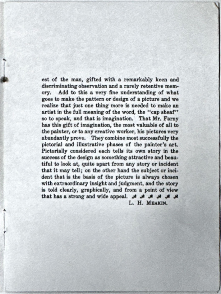 It seems needless to say that the pictures of Mr. Farny speak for themselves better than any words can. They are the outcome of a lifetime of absorbed and concentrated interest. His early work shows to some extent the influence of Munkacsy of whom he was a friend and naturally a great admirer. This influence, however, soon disappeared and with the finding of a field that he soon made his own he adopted a manner of expression equally his own and that was best suited to what he wanted his pictures to say.