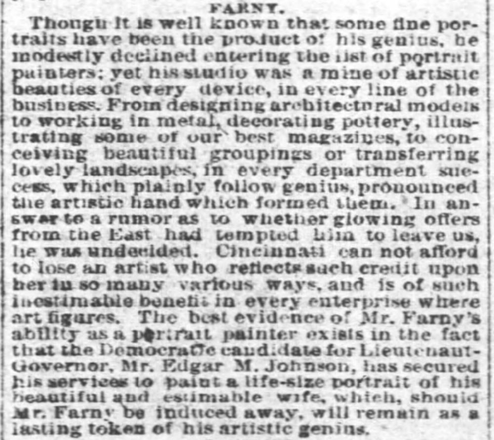 The article concluded that the best evidence for Farny’s success as a portrait painter was the fact that Mr. Edgar M. Johnson, Democratic candidate for Lieutenant-Governor (a race he lost), had convinced Farny to paint a life-size portrait of his wife. Unfortunately I could not discover Edgar’s wife’s name nor could I determine if this portrait was ever completed.