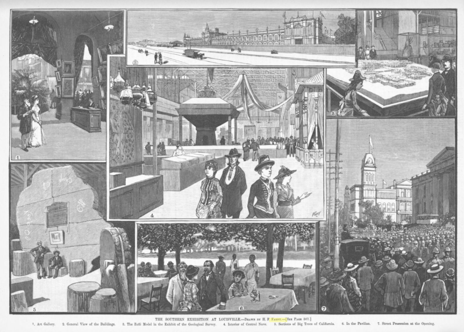 As in 1883 and 1884, Farny attended the Southern Exposition in Louisville and Harper’s Weekly published his illustration from the event. It appeared in the August 29, 1885, issue, pg 567.
