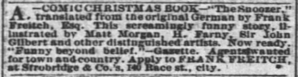 With Christmas 1880 approaching, the Cincinnati Enquirer announced on December 7th that “Frank Freitch” had released a new book, “The Snoozer”. Translated from a German book and illustrated by Farny, Matt Morgan, and others, the comic creation was “funny beyond belief”. According to the brief article, Frank was hoping to find agents for the book. I searched all over hoping to find any evidence of the book, but had not luck. I also didn’t learn any more about Frank “Freitch”.