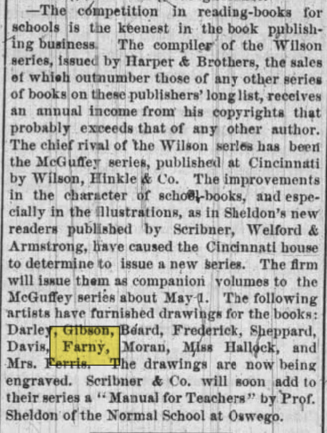 In late February, 1875, Farny traveled east to NY and Philadelphia. While traveling, The Buffalo Commercial reported that Farny, Thomas Moran, and others had furnished drawings for the new McGuffey children’s books and that the illustrations were being engraved. This is the first report I could find that linked Farny to the McGuffey readers, though another article clarified that the images were for the T. W. Harvey written readers, a new line of illustrated kids readers that Wilson, Hinkle & Co. were introducing.