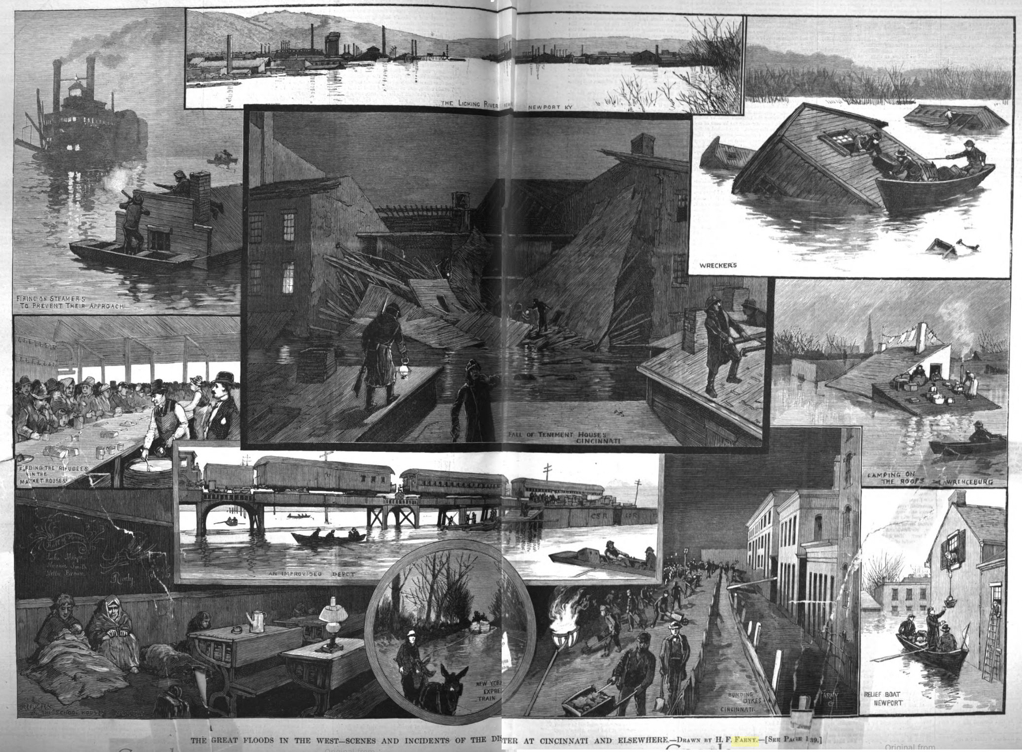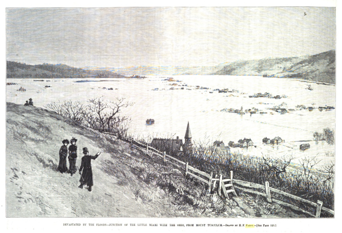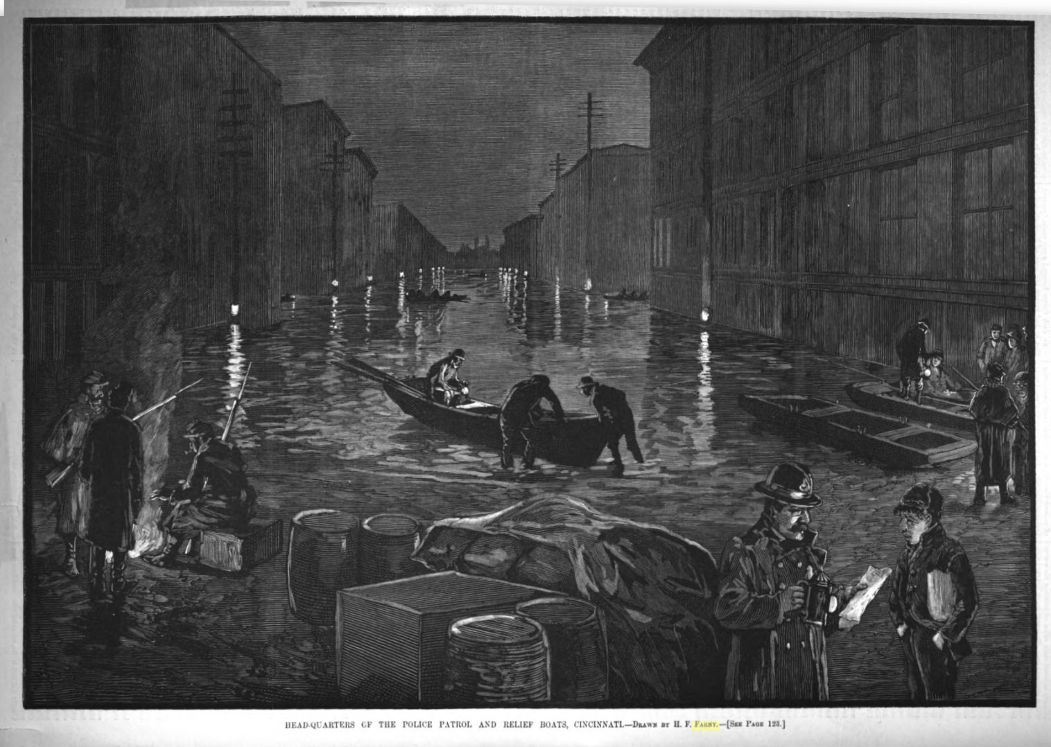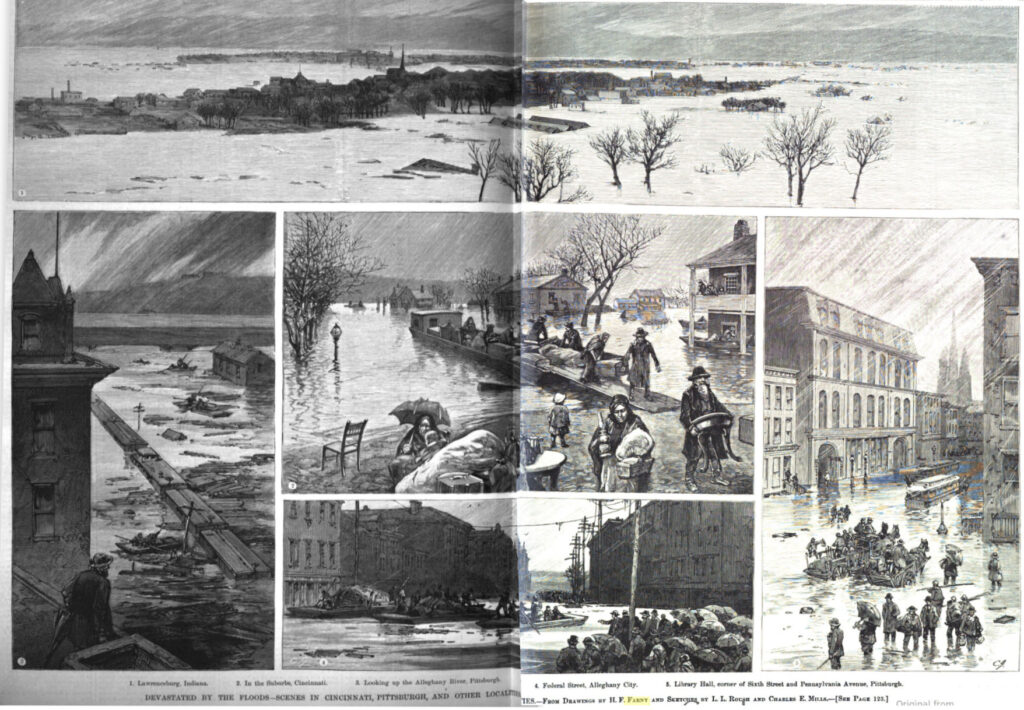 In 1884, the Ohio flooded again. And, once again, Farny produced illustrations for Harper’s Weekly, this time appearing in the February 25, 1884, issue. This image appears on page 121: