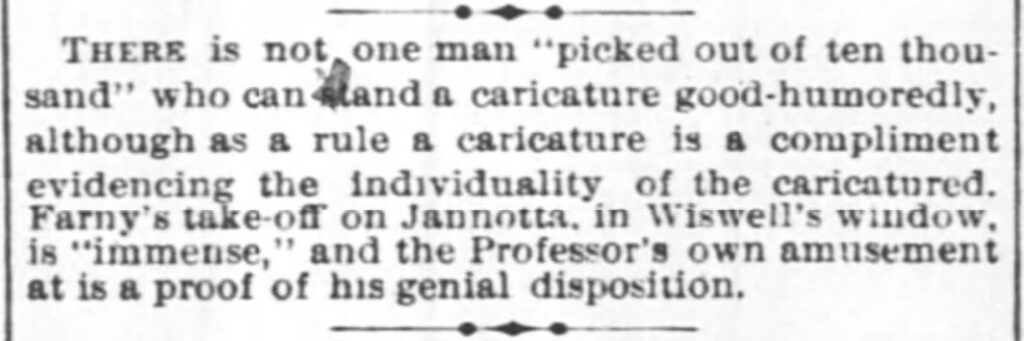 A July 20, 1877, article on page 8, column 4, in The Cincinnati Enquirer noted that a caricature by Farny of “Jannotta” had been placed in Wiswell’s window for customers to admire. An Italian immigrant by way of London and Boston, Alfedo Jannotta (1843-1913) had been in Cincinnati for seven years by 1877, overseeing the city’s Cincinnati Choral Society, as well as organizing the city’s first orchestra. Jannotta apparently had a good sense of humor, for he was, based on the July 20th article, amused at Farny’s caricature of him.