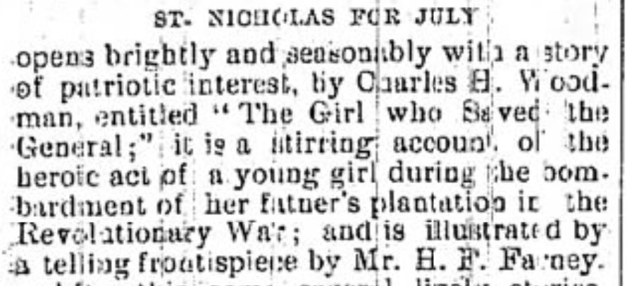 The July 1878 issue of St. Nicholas Magazine included Farny’s sketch for Charles H. Woodman’s true account of how a little girl saved future War of 1812 General John R. Fenwick’s life when he was a baby.