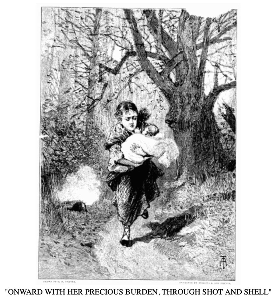Farny’s sketch appeared with the caption, “Onward with her precious burden, through shot and shell,” on page 576 of the July 1878 issue, volume 5, number 9