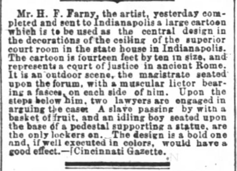 In June of 1877 Henry Farny is reported to have completed a 14ft x 10ft design for the superior courtroom in the Indiana Statehouse in Indianapolis, Indiana. The image depicted a court of justice in Ancient Rome, with a magistrate overseeing two lawyers arguing a case between them. The design was part of an effort to build a new courthouse, as the old one’s ceiling had collapsed.