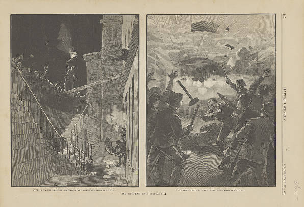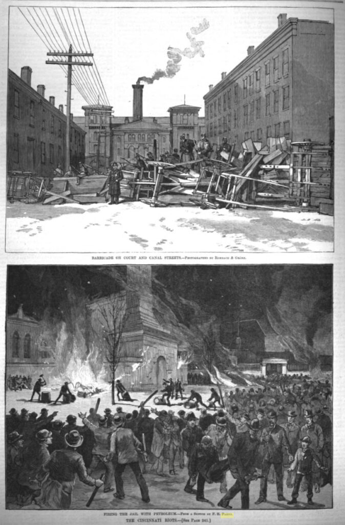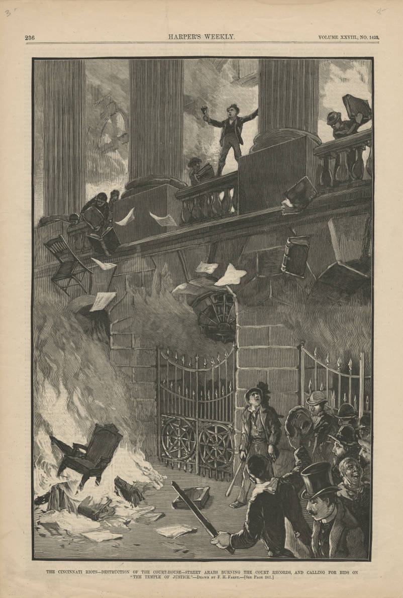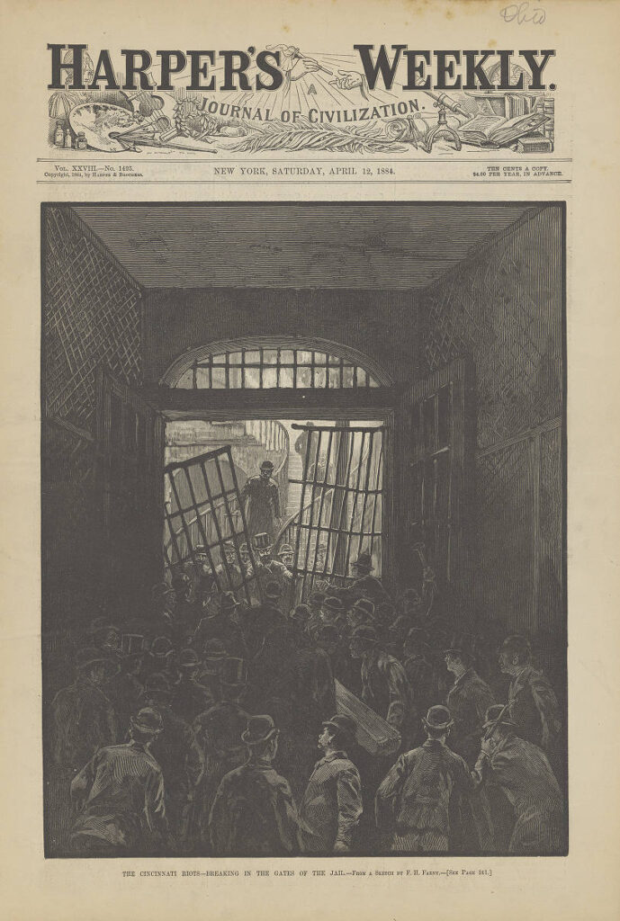In March 1884 one of the largest riots in American history took place in Cincinnati. The match that lit the crowd’s flame was a defendant who was charged with manslaughter rather than murder. Farny, realizing the crowd looked ready for trouble, watched and sketched the event.