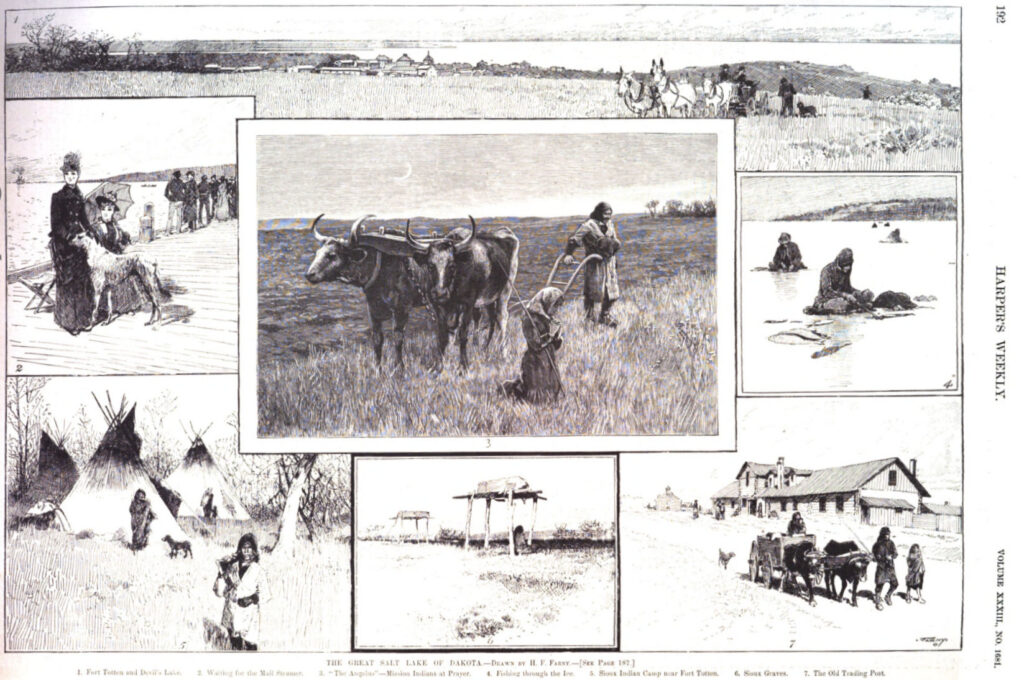 In the March 09, 1889, Harper’s Weekly published Farny’s sketches of a natural Salt Lake that now lies on the border of Minnesota and South Dakota. If he visited the lake, I have not documentation to support that. Two of the images, the funeral pyre and the Indian encampment, appear drawn from previous works.