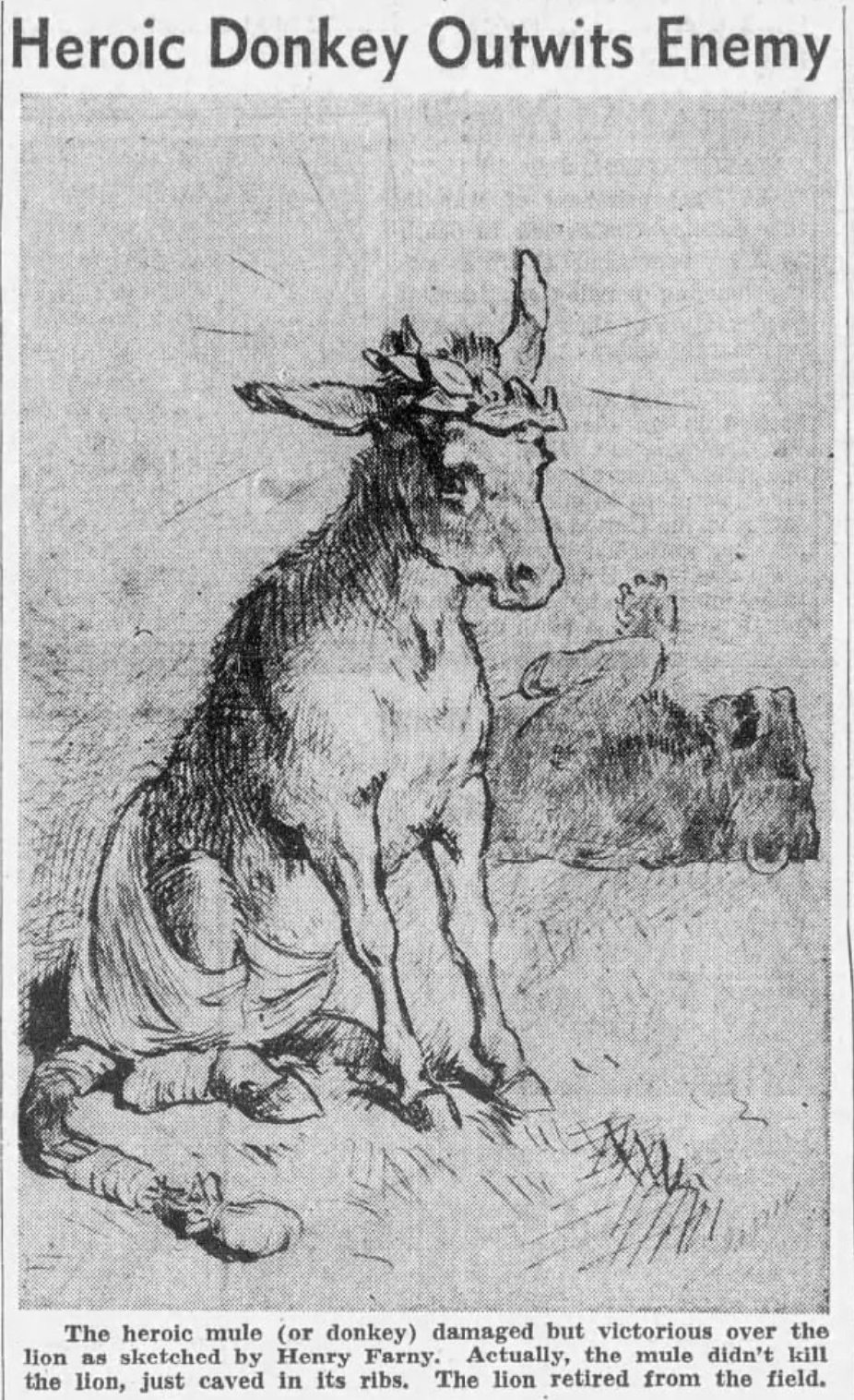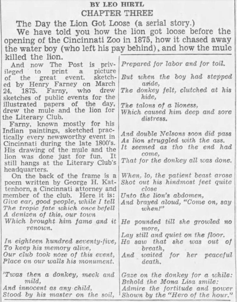 On March 25, 1875, Henry Farny sketched “The Hero of the Hour”, a drawing that immortalizes the death of a lion at the “hands” of the hero, a mule. According to a serialized story printed between July 16 – 19, 1945, in the Cincinnati Post, the lion managed to escape its cage at the yet-to-be-opened Cincinnati Zoo (known as the Zoo Zoo at the time) just as a water boy was trying to give water to the lion. The boy made a break for it, leaving behind his wages, while the mule defended the boy and badly hurt the lion. The lion limped away until hunters were able to kill it. Unfortunately, the mule also succumbed to injuries.