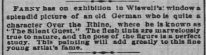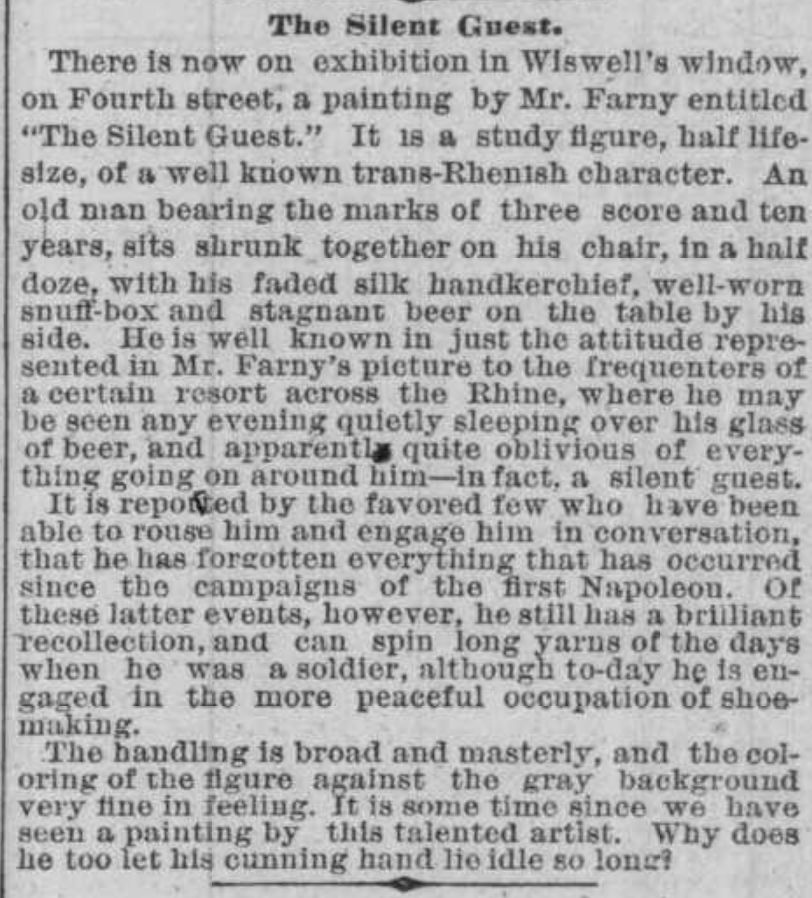 While Farny and Wald could not get the man to speak, The Cincinnati Commercial reported at the time of Farny’s painting that a few lucky folks had heard the Silent Guest’s story, of how he served during the Napolenoic wars in Europe, how he couldn’t remember much after that, and how he supported himself at the age of 70 as a shoemaker.