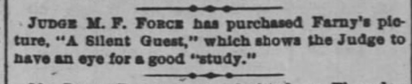 “The Silent Guest” didn’t remain on sale for long. Within a couple days it sold to Judge Manning Ferguson Force. Judge Force had moved to Cincinnati in 1848, shortly-thereafter joining the Literary Club, where he befriended future US president Rutherford B. Hayes, with whom he would have a long relationship. Force served in the Civil war, then returned to Cincinnati. In 1877, he joined the faculty of the Cincinnati Law School and was also elected judge of the Superior Court of Cincinnati. In 1878 he bought “The Silent Guest” from his fellow Literary Club member Henry Farny. The Hayes Presidental Center holds the Manning Force papers.
