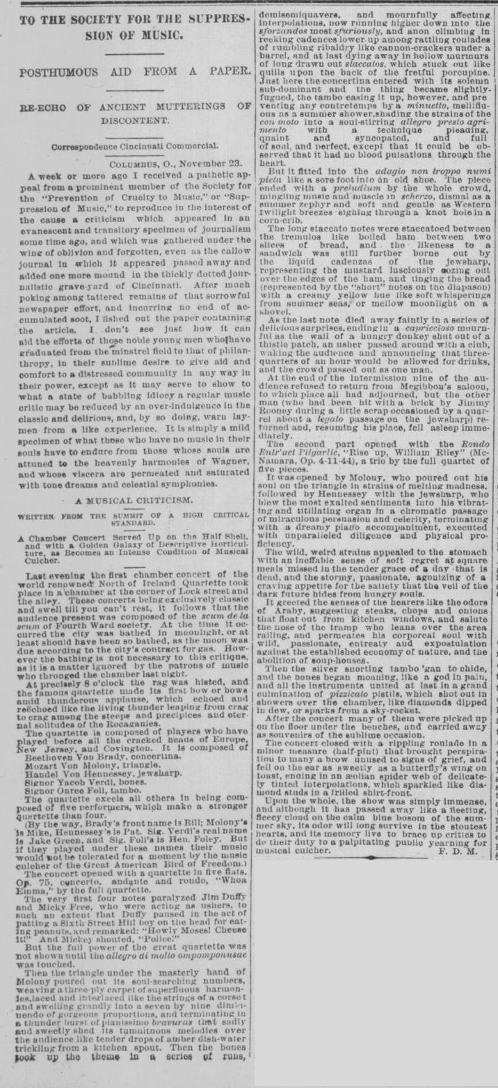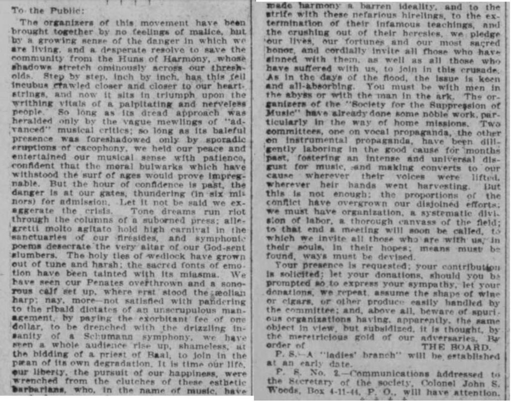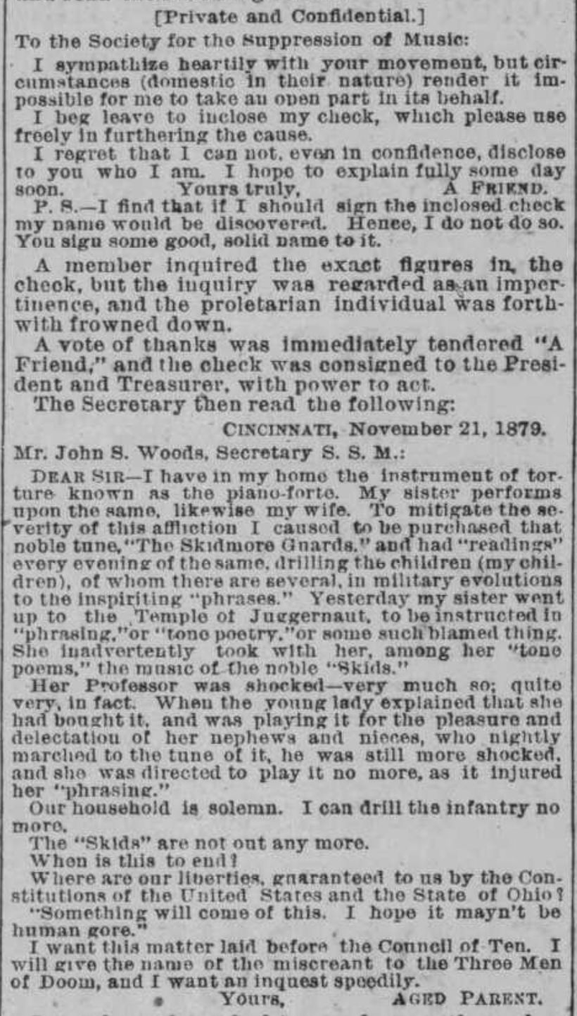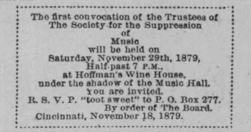 So how and why did this organization come about? The organization’s beginnings aren’t entirely clear, but *might* be rooted in a criticism published in an unknown newspaper prior to November of 1879. The article was reprinted, according to the Cincinnati Commercial, in its November 24, 1879, edition, at the behest of the Society for the Suppression of Music.