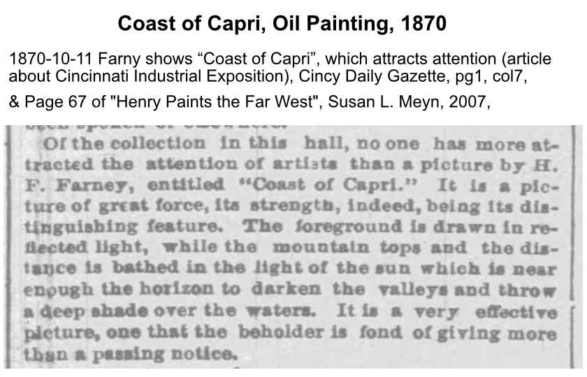 Henry Farny entered his painting, the Coast of Capri, at the 1870 Cincinnati Industrial Exposition. As the excerpt below notes, the painting attracted quite a bit of attention. The excerpt below is from the October 11, 1870, issue of theCincinnati Daily Gazette, page 1, column 7.
