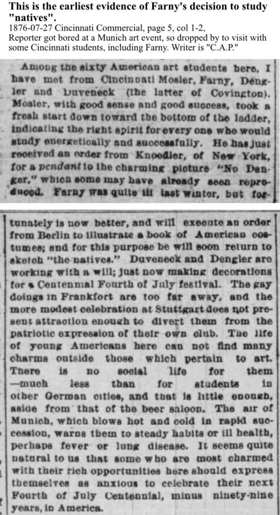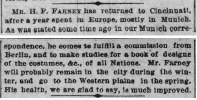 A year later, in July 27, 1876, we learn from a reporter in Germany that Farny spent the winter very sick. By summer his health had returned. We also learn that Farny secured a German contract to illustrate American Costumes and that he planned to return the the United States so he could sketch “the natives”.