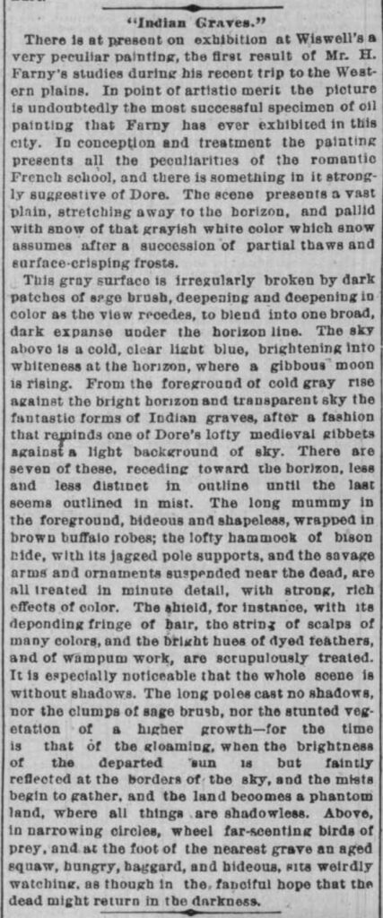 The article also discusses Farny’s newest painting in depth, a result of his recent trip west. The article is titled Indian Graves, but it’s not clear if this was the actual title of the painting or not (it was later called “Death” at the 1893 Farny exhibit). What we learn in the article is that this painting features at least seven “graves” or pyres, the moon on the horizon and distant birds of prey. We also learn that Farny plans to make another painting from this one. It sounds more “study-like” than finished product. In fact, it may have been more a whim due to the Sketch Club’s theme that month, which was “death” for which this was supposedly created.