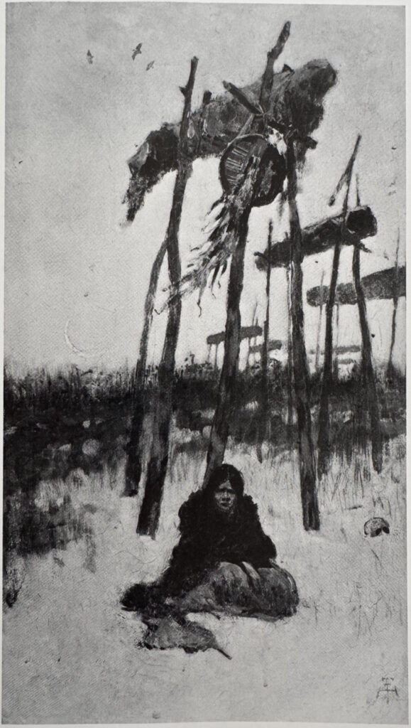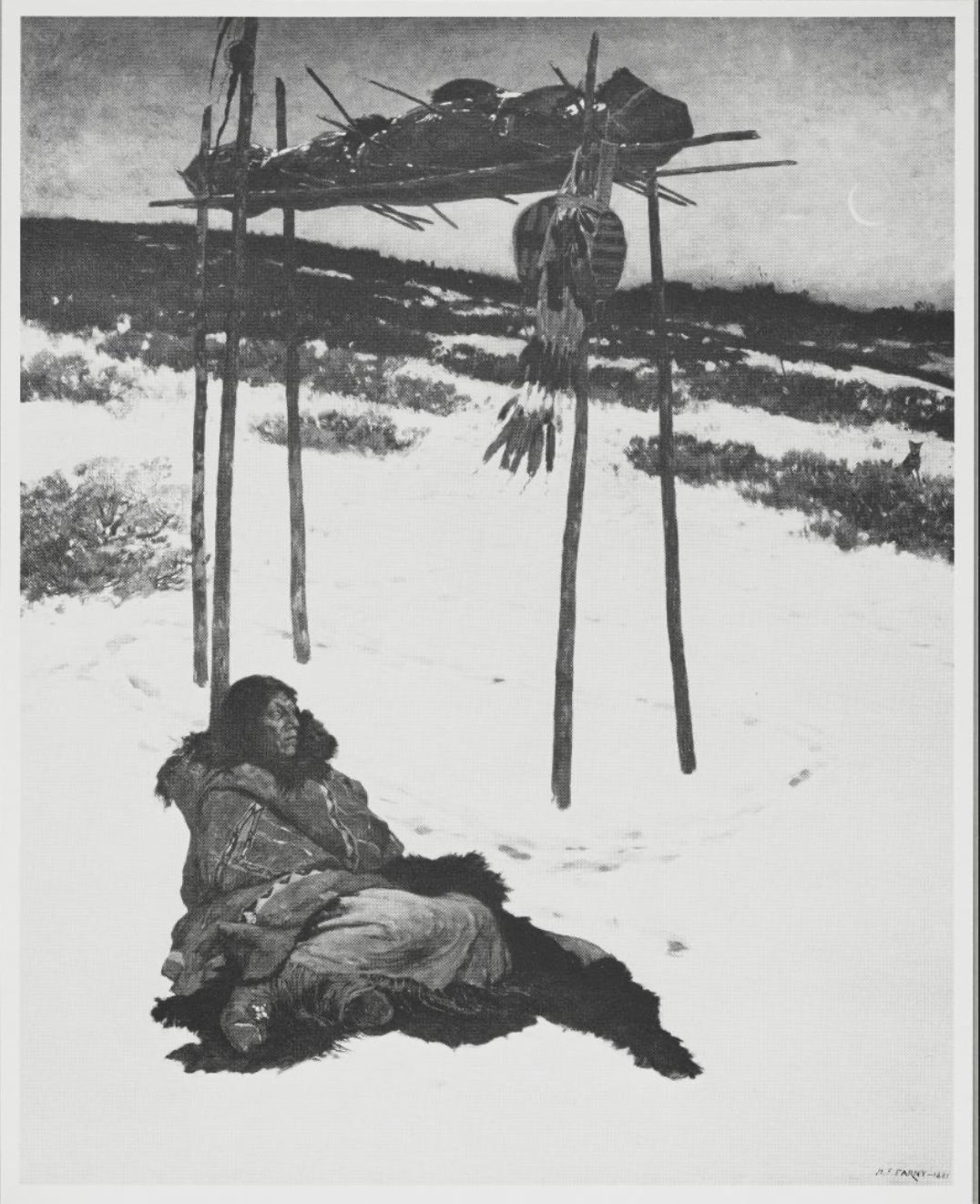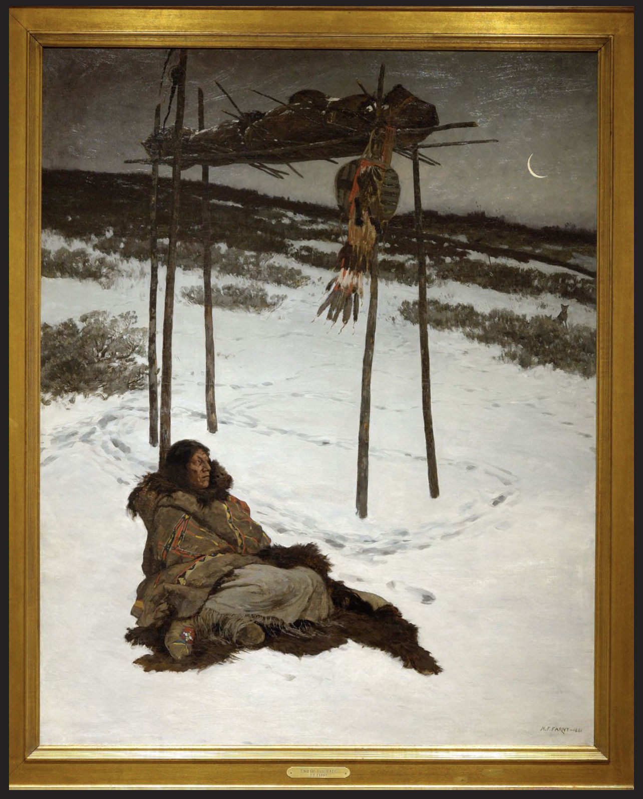 He wrote: H. F. Farny’s “Last Vigil,” painted in 1881, is a picture possessing special interest, not alone on account of its being a striking subject, boldly and unconventionally handled with a deeply-conceived vein of sentiment, but because it was the first product of the artist’s determination to devote himself thence forward to the pictorial perpetuation of the aboriginal life of the Western plains, so rapidly disappearing before the inexorable oncoming of the white settlers.