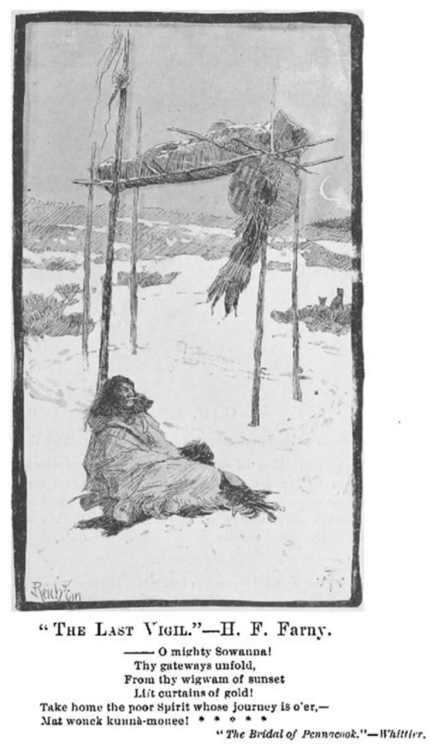One More Pyre: In 1891, Farny submitted a sketch to the February 14, 1891, edition of Harper’s Weekly. On page 120 is one last funeral pyre by Farny, different enough to be unique from the others. It was titled, The Last Scene of the Last Act of the Sioux War: