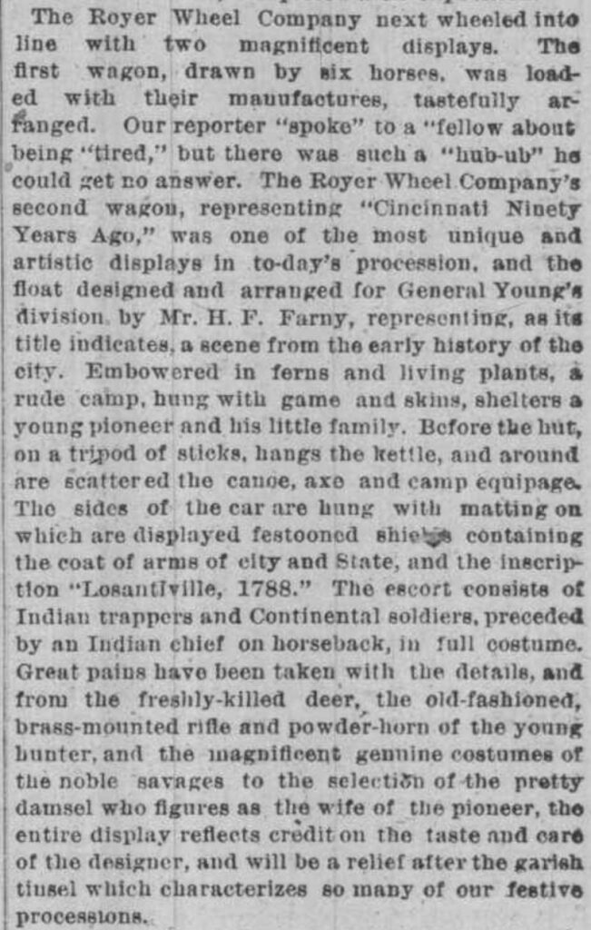 For the annual Cincinnati Exposition Procession in 1879, a parade that wandered through downtown Cincinnati celebrating the yearly expo, the Royer Wagon Company hired Henry Farny to decorate a wagon. According to one newspaper account, Farny’s efforts were a success as Royer wagon was a “most unique and artistic” display. The design celebrated the early history of Cincinnati, which included the description “Losantiville, 1788”, an early name for what became Cincinnati.
