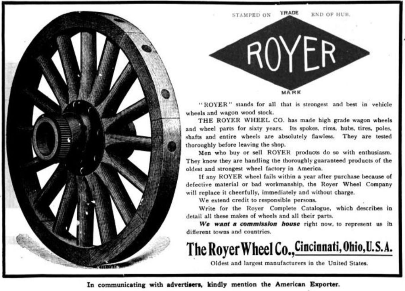 The Cincinnati-based Royer Company was formed in 1851. After successful sales during the Civil War, in 1865 the company secured the rights to use the Sarven Wheel, a celebrated design leap in wheel design. Reports indicate the company was well-managed and successful, so could have afforded to put on a splashy display for the 1879 procession. Apparently, the shift towards automobiles doomed the Royer Wheel Company.